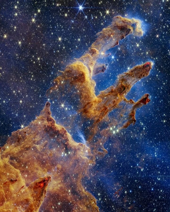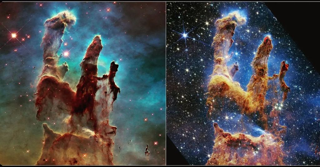 Pilares da Criação Imagens Hubble e Webb Lado a Lado